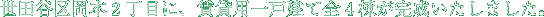 各棟玄関前にはパーゴラを設置、駐車スペースには耐久性を考慮しマットスタンプにて枕木を作成いたしました。こちらは竣工会にて大好評でした。 今回の注文住宅は、人気の「世田谷岡本地区」。賃貸用と言って手を抜く訳にはいきません。閑静で格式ある街並みに劣らない外観。当初は賃貸住宅ではございますが、貸主様の生活状況・設計に対応すべく、必要な時必要な区画を売却できるように設計・建築いたしました。売却時にも、近隣物件にひけをとらない物件と自信を持って言える物件です。