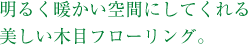 木のぬくもりを感じ暖かく優しい空間を作りだしてくれるフローリング。好みの色をお選び頂き、あなたの理想的な空間を演出してみませんか?